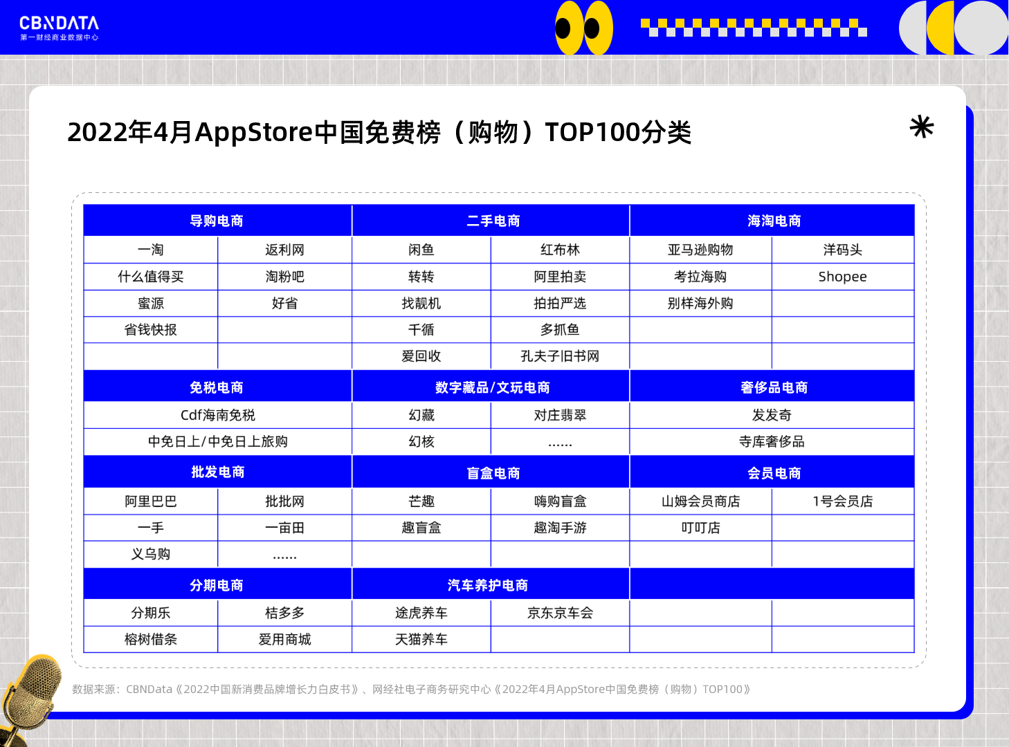 2003年中国开启电商时代。经过近20年的发展,各类平台百花齐放,电商渠道已变得极为丰富。《2022中国新消费品牌增长力白皮书》数据显示,除淘宝、京东等综合电商外,二手电商、导购电商、海淘电商等多种类型的App上榜AppStore中国免费榜(购物)TOP100。
