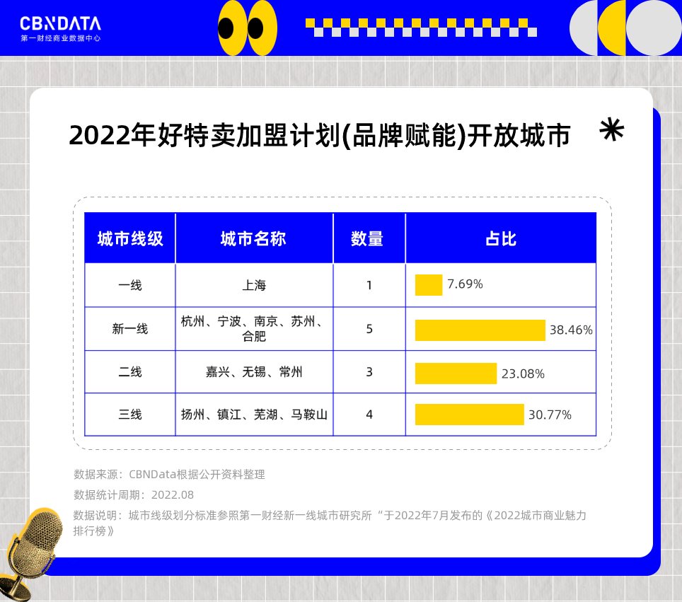 为了实现进一步增长,部分临期折扣企业迎来转型阶段。一方面对模式进行多元探索。例如金佰佰的店Auskin尝试3个月临期折扣店,便转型为正期仓储折扣店;以社区超市场景为主的小象生活推出超1000平米的大型门店;社区连锁超市折扣牛推出24小时硬折扣超市、社区会员生鲜店两大店型。另一方面不少玩家向下沉市场渗透。根据好特卖的加盟计划,沿用“好特卖”品牌的加盟模式所开放的城市中,二线、三线城市占比超一半。